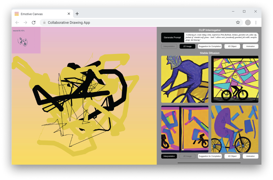 Emotive Canvas aims to propose new methods for digital drawing by using the user's emotional state as parameters for controlling the tool. In this prototype, two modes of drawing are explored: one for use with the drawing app alone and the other for use in a multi-user configuration. When the app is used in single-user mode, facial expressions dictate both the line weight (brushstroke size) and brush color. This could be based on common emotion-color associations, such as red being associated with anger and blue with calmness. In multi-user mode, the line weight mapping remains the same, but color is used to assign a unique user ID.